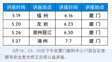 另外,為向廣大近視朋友普及近視防治的常識(shí),廈門眼科中心定期舉辦近視矯治公益講座。具體時(shí)間安排如下: