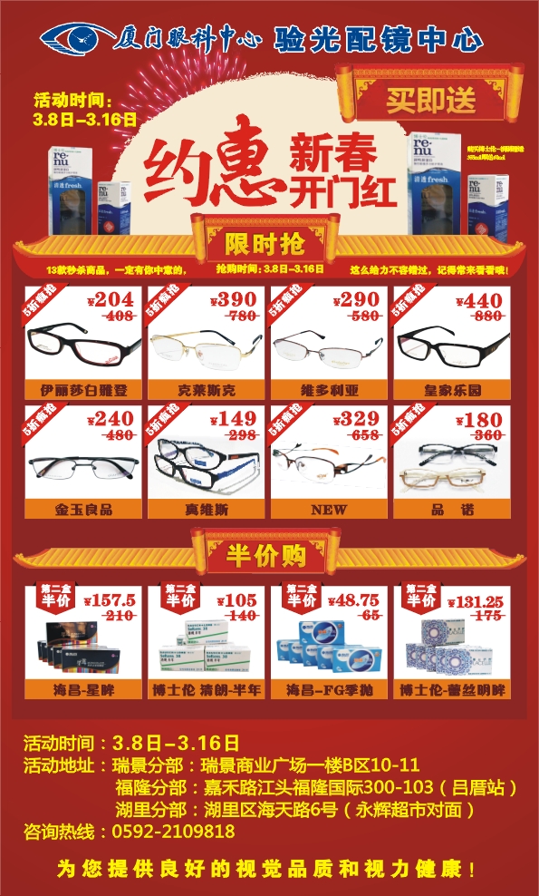 【文章導讀】【活動時間】3.8日-3.16日 【活動內(nèi)容】 1、推出八款高檔光學鏡框:伊利莎白雅登、維多利亞、真維斯、NEW、品諾、金玉良品、克萊斯克、皇家樂園,5折優(yōu)惠! 2、同時推出4款隱形眼鏡