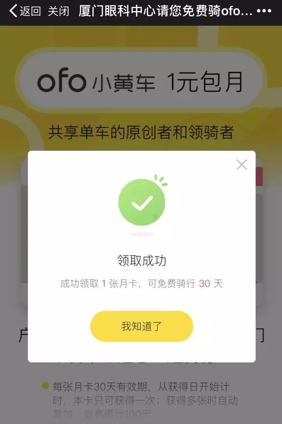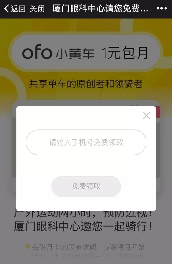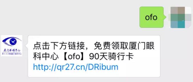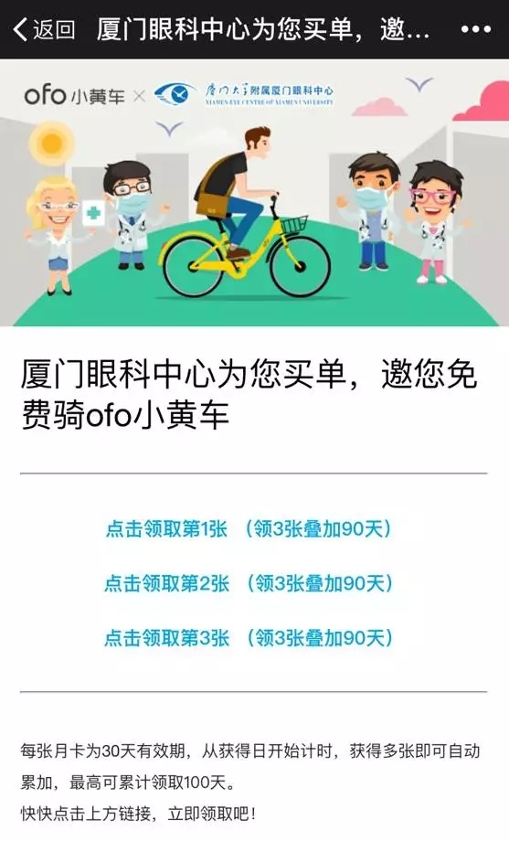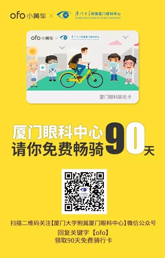 關(guān)注廈門大學(xué)附屬廈門眼科中心微信公眾號(xmyanke),回復(fù)ofo,點(diǎn)擊鏈接領(lǐng)卡;或者直接點(diǎn)擊【關(guān)于我們】→【免費(fèi)騎行】參與活動。