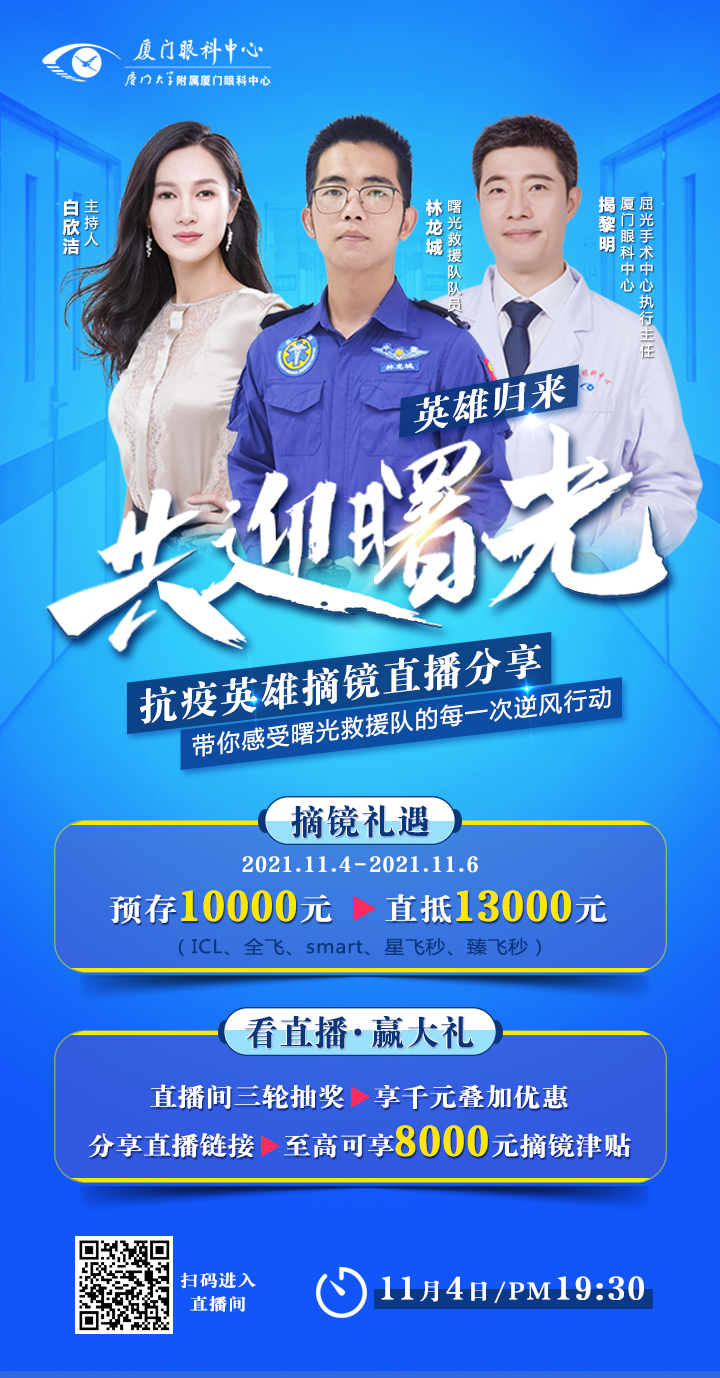11月4日19:30,抗疫英雄、廈門眼科中心公益摘鏡體驗官——林龍城將通過直播分享他的曙光故事、抗疫經(jīng)歷及摘鏡體驗,廈門眼科中心屈光手術中心執(zhí)行主任、主任醫(yī)師揭黎明將現(xiàn)場揭秘手術過程。