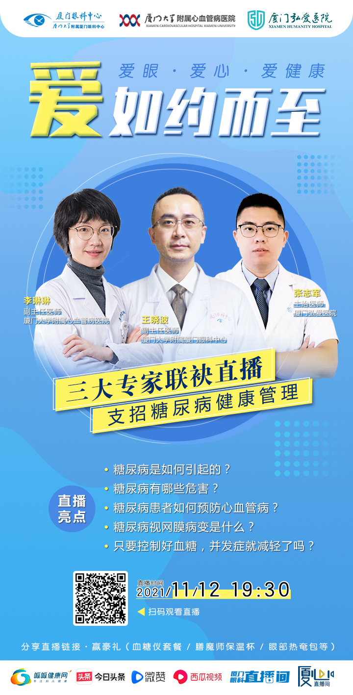 11月12日(周五)晚19:30,廈門大學(xué)附屬廈門眼科中心攜手廈門大學(xué)附屬心血管病醫(yī)院、廈門弘愛醫(yī)院共同開展聯(lián)合國糖尿病日大型公益直播活動。