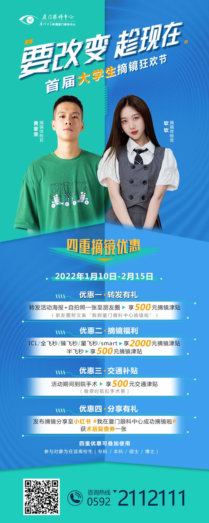 守護(hù)光明,溫暖助力【文章導(dǎo)讀】2022年1月10日-2月15日 廈門眼科中心 大學(xué)生摘鏡狂歡節(jié) 席卷卷卷卷而來 四重摘鏡福利 丟掉眼鏡 丟掉煩惱 要改變 趁!現(xiàn)!在! 讓我們一起做 新時代有才有為有顏值的高知分子吧 活動時間:
