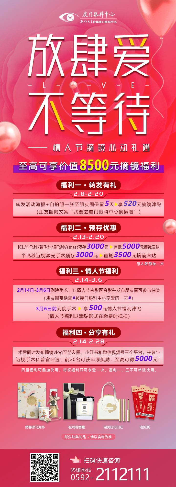 2月14日-3月6日前到院手術,在屈光中心情人節(jié)布景區(qū)合影并帶話題#被廈門眼科中心寵愛的一天#,發(fā)布至朋友圈即可參與抽獎。