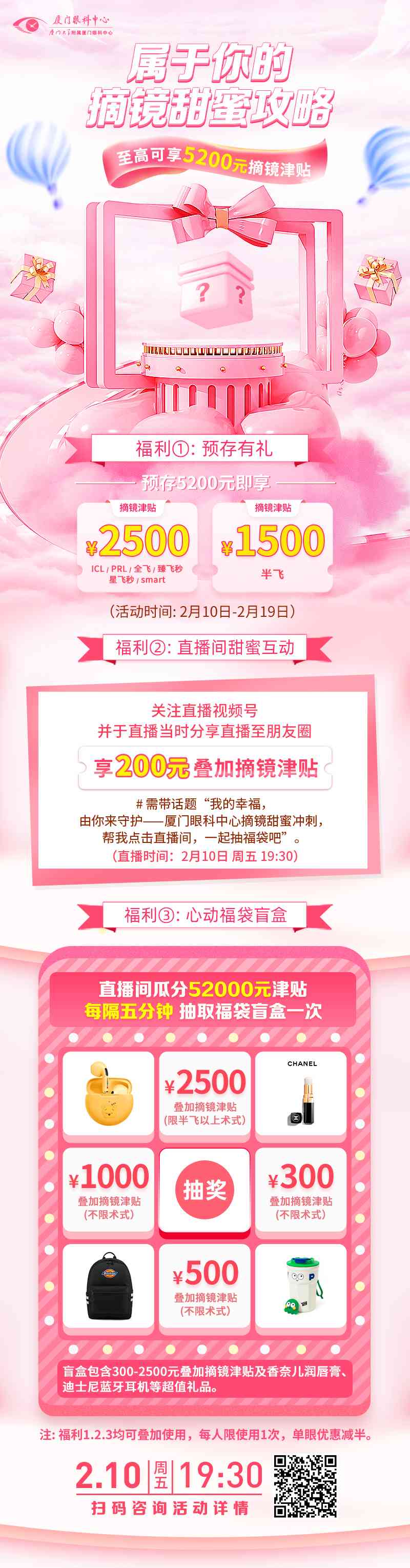 觀看直播,并分享直播至朋友圈,帶話題「我的幸福,由你來守護(hù)——廈門眼科中心摘鏡甜蜜沖刺,幫我點擊直播間,一起抽福袋吧」,即享200元疊加摘鏡津貼。