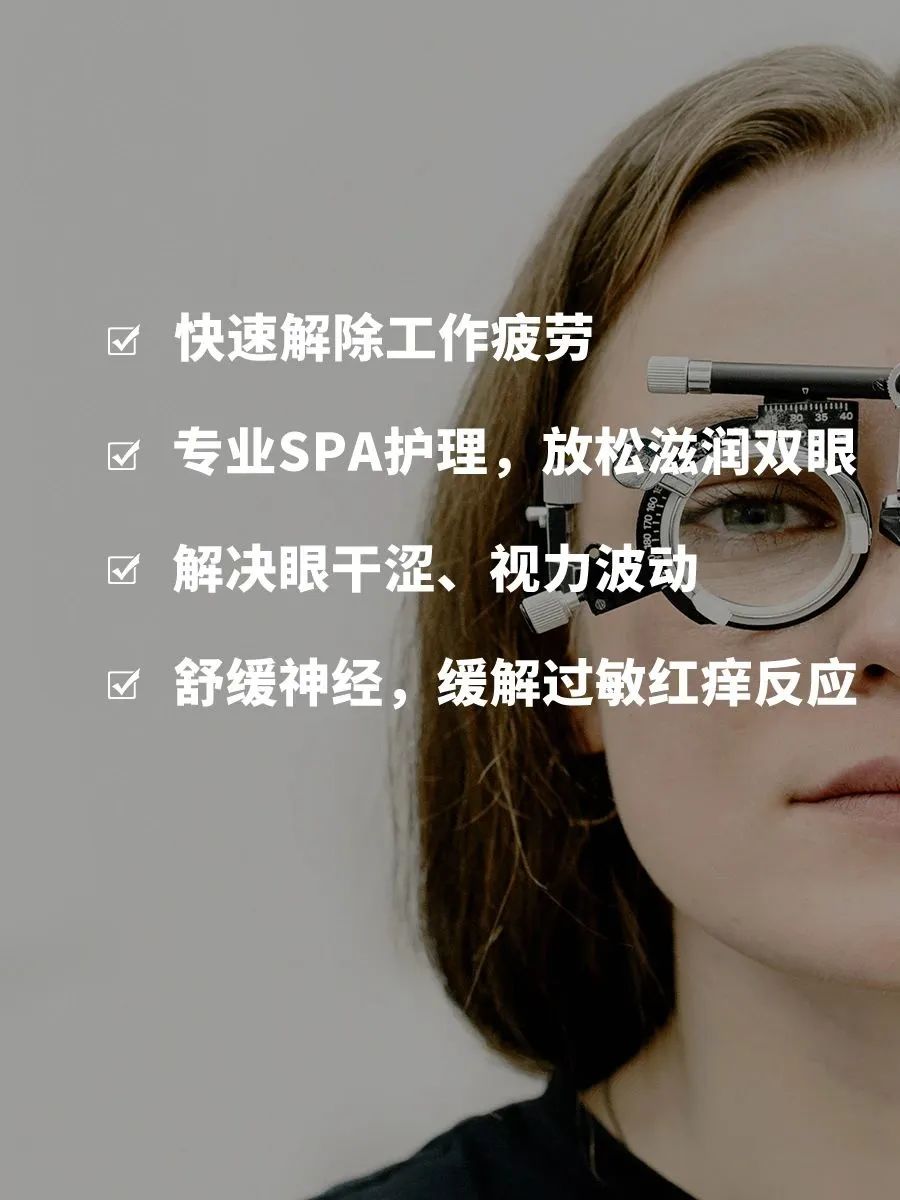 眼部SPA適用問題:疲勞干澀、眼紅血絲、眼睛發(fā)癢、眼睛浮腫、視力波動、眼睛敏感