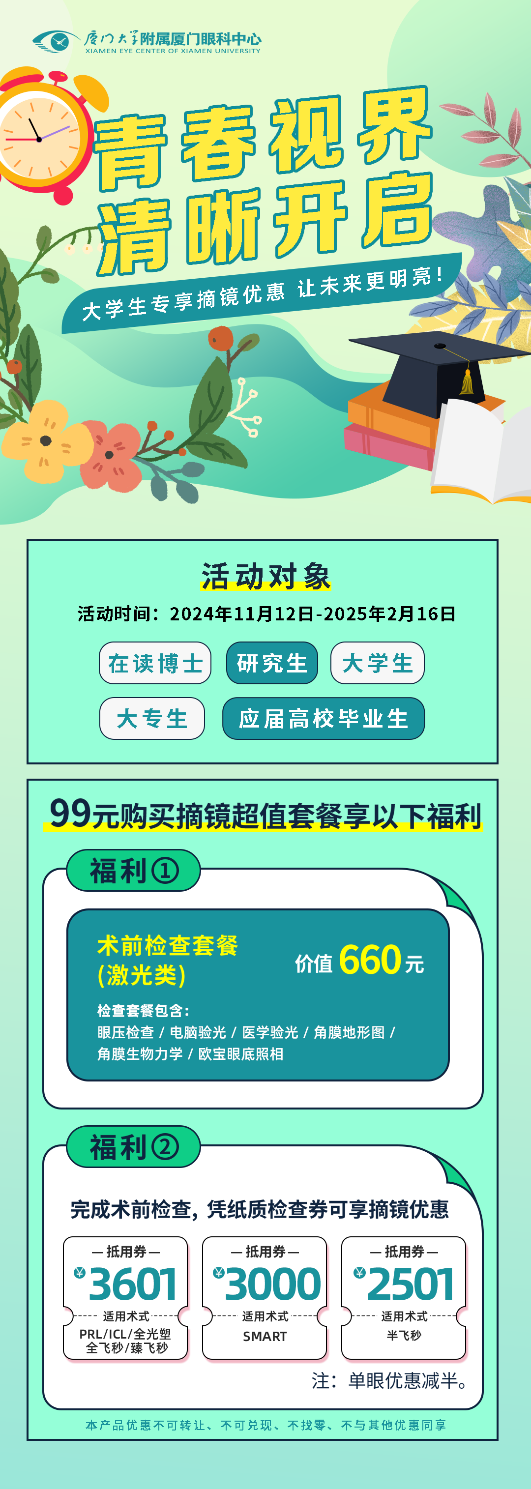 以上就是關(guān)于“2024福建大學(xué)生做近視手術(shù)有優(yōu)惠嗎”問題的詳細(xì)內(nèi)容,如果你是大學(xué)生,想要擺脫眼鏡的束縛,不妨抓住這次的機(jī)會,到廈門眼科中心進(jìn)行詳細(xì)咨詢和術(shù)前檢查,選擇適合自己的近視手術(shù)方式,開啟清晰的新世界。