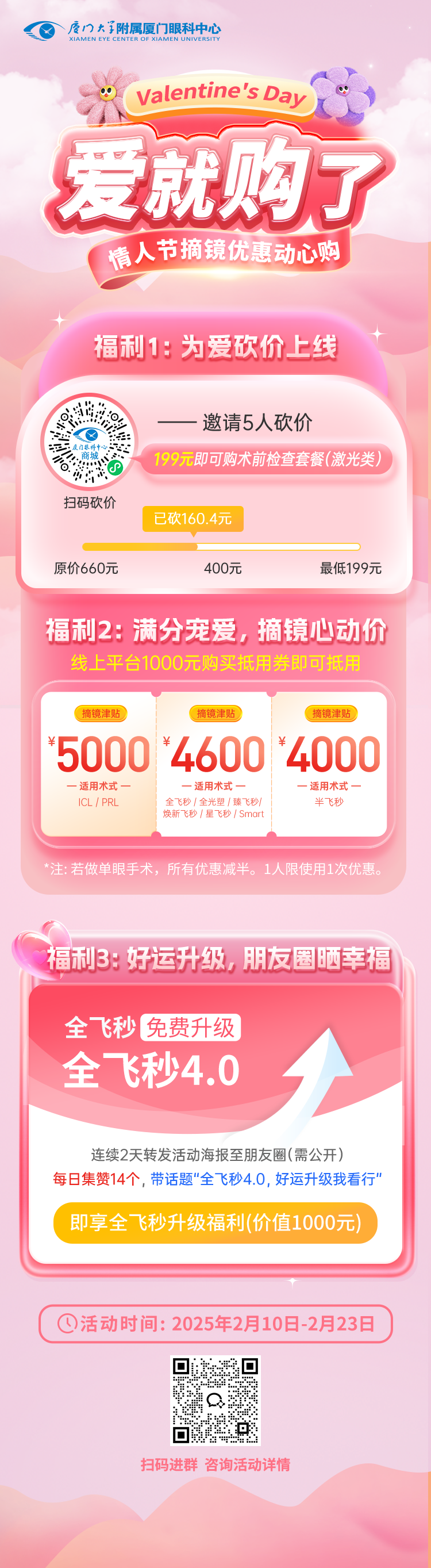 連續(xù)2天轉(zhuǎn)發(fā)活動海報至PYQ(需公開無分組),附文案“全飛秒4.0,好運升級我看行”,每天集贊14個,即享全飛秒升艙福利,以全飛秒3.0價格完成4.0手術(shù)(優(yōu)惠1000元)。