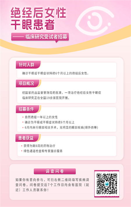 該項(xiàng)臨床研究的組長(zhǎng)單位是廈門大學(xué)附屬眼科中心,主要負(fù)責(zé)人是劉祖國(guó)教授,針對(duì)的是確診干眼或干眼癥狀持續(xù)6個(gè)月以上的絕經(jīng)后女性。若符合招募條件,成功報(bào)名參與后您將獲得為期8周的藥物治療,以及綠色通道檢查和專家面診服務(wù)。