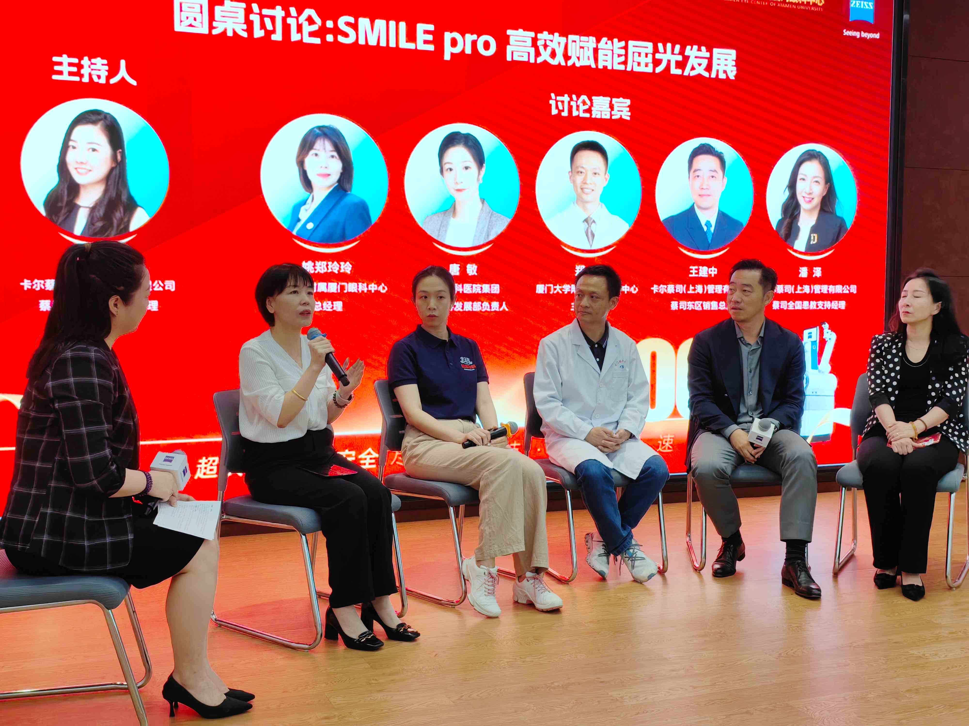 廈門眼科中心總經(jīng)理姚鄭玲玲、華廈眼科醫(yī)院集團屈光學科發(fā)展部負責人唐敏、廈門眼科中心屈光科主任醫(yī)師鄭林、蔡司眼科大東區(qū)銷售總監(jiān)王建中、蔡司醫(yī)療屈光全國患教經(jīng)理潘澤等嘉賓,圍繞SMILE Pro技術在屈光領域的應用現(xiàn)狀、未來發(fā)展、提升手術質(zhì)量與患者體驗等議題展開深度探討: