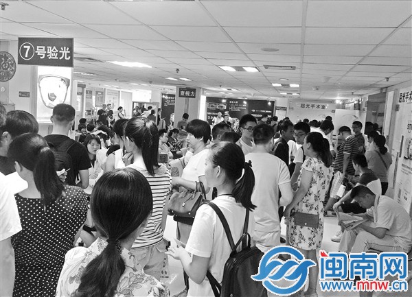 廈門(mén)眼科中心候診大廳擠滿(mǎn)陪同來(lái)做近視激光手術(shù)患者的家屬