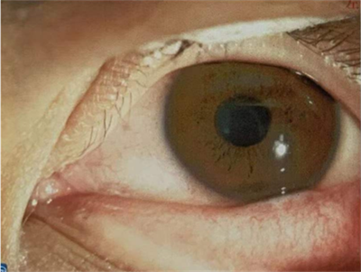 小森的右眼就是角膜變薄導致角膜內層結構破裂,角膜出現水腫,視力驟降,屬于急性圓錐角膜發(fā)作。商旭敏博士接診時(shí),距離小森發(fā)病已過(guò)去了2天,他的右眼角膜已呈現肉眼可見(jiàn)的白色。