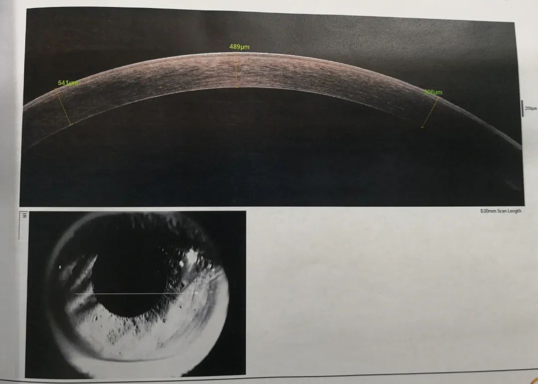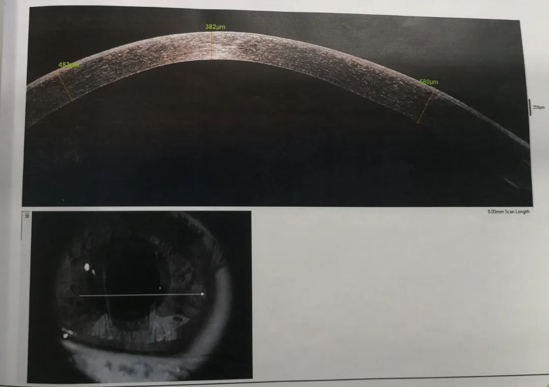 小雨重新回憶起之前的診治經(jīng)歷,確定此前的檢查中并沒(méi)有圓錐角膜的檢查,羅順榮副主任為她完善了相關(guān)檢查。檢查結果顯示,小雨左眼還是圓錐角膜初期,但右眼已經(jīng)是圓錐角膜的完成期,左眼角膜厚度為489μm,而右眼僅剩下382μm。