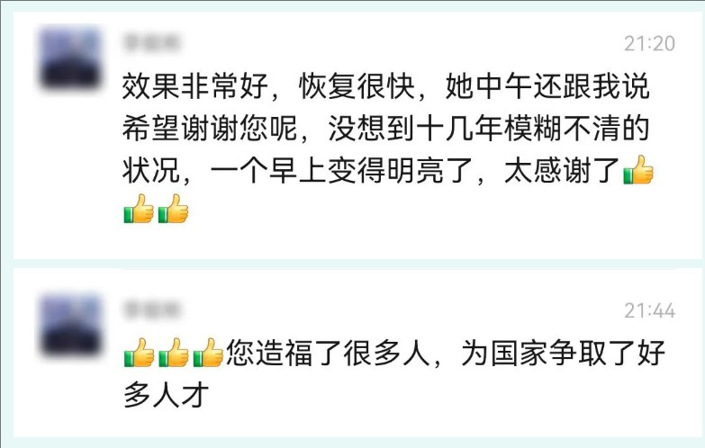 "效果太好了,恢復特別快!沒(méi)想到十幾年模糊不清的世界,一個(gè)早上就亮了,太感謝了!"