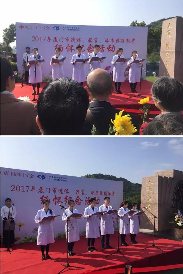 活動(dòng)中,廈門(mén)大學(xué)附屬廈門(mén)眼科中心醫務(wù)工作者們帶來(lái)了《生命的禮物》的詩(shī)朗誦表演,表達了對捐獻者無(wú)償獻出珍貴“生命禮物”的崇敬與感恩之情。廈門(mén)大學(xué)醫學(xué)院青年志愿者協(xié)會(huì )在紀念碑前宣誓并遞上了獻花。捐獻者紀念碑前,手捧白菊的人群中,有蹣跚而行的白發(fā)老人,有一臉稚氣的年幼孩童,更多的是中年人和青年人。人群中,有人哭泣,有人默默佇立,一遍遍撫摸著(zhù)刻在紀念碑上親人的名字。