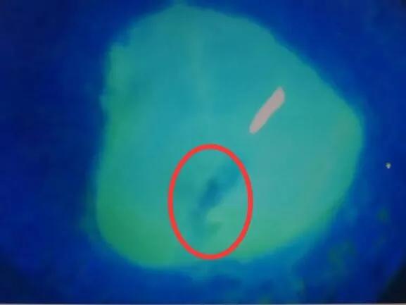 老楊右眼術(shù)前熒光造影照片—紅色圓圈中黑色區域為角膜穿孔的部分