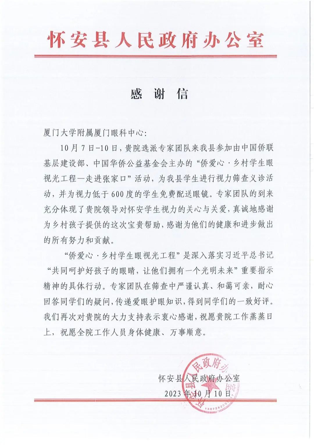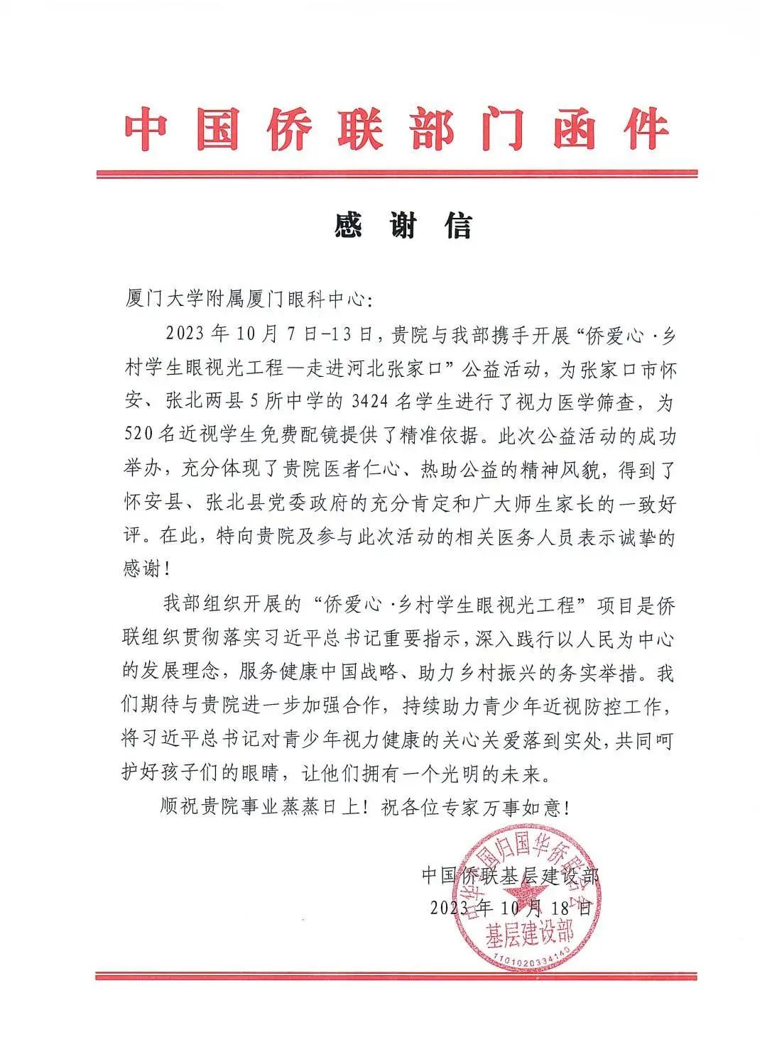 近日,廈門(mén)眼科中心接連收到來(lái)自中國僑聯(lián)基層建設部、懷安縣和張北縣人民政府辦公室的三封感謝信,信中對廈門(mén)眼科中心在“僑愛(ài)心·鄉村學(xué)生眼視光工程-走進(jìn)河北張家口”公益活動(dòng)中的無(wú)私付出及對鄉村孩子的寶貴的幫助給予充分認可與真摯感謝。