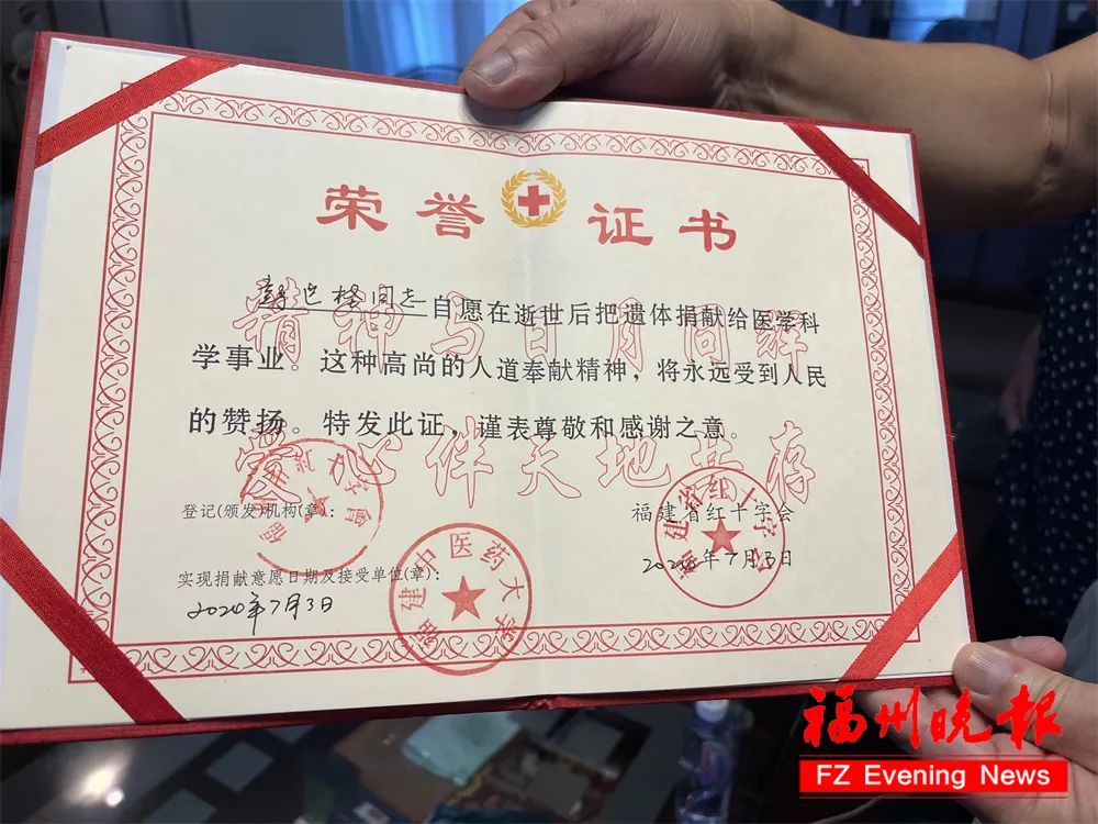 當晚9時(shí)多,按照其遺愿,他如愿以?xún)?,捐獻有用的器官——眼角膜,并“坐”上開(kāi)往福建中醫藥大學(xué)的車(chē)子,成為一名大體老師(醫學(xué)界對遺體捐贈者的尊稱(chēng))。