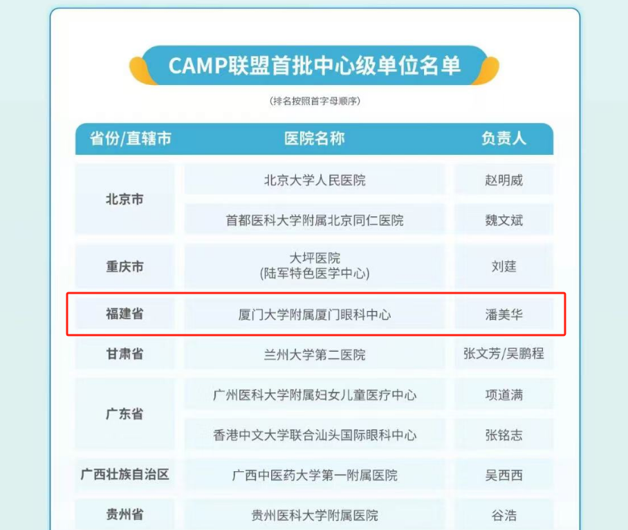 CAMP由國家眼部疾病臨床醫學(xué)研究中心牽頭組建,在健康中國戰略和近視防控政策的指引下,以持續提升基層眼健康服務(wù)能力為核心,旨在通過(guò)整合眼科醫療資源、科研力量和臨床經(jīng)驗,聚力構建一個(gè)高效、協(xié)同、創(chuàng )新的近視防控服務(wù)體系和覆蓋全國的眼健康醫療服務(wù)網(wǎng)絡(luò )。聯(lián)盟啟動(dòng)報名后,共有來(lái)自29個(gè)省和直轄市的434家醫療機構報名,其中報名參選中心級單位的有108家,最終遴選出首批中心級單位33家。此次廈門(mén)大學(xué)附屬廈門(mén)眼科中心成功獲選為中心級單位,標志著(zhù)醫院在國內眼科領(lǐng)域尤其是近視防控領(lǐng)域具有顯著(zhù)的影響力和專(zhuān)業(yè)能力,是聯(lián)盟推進(jìn)近視防控工作的重要力量。