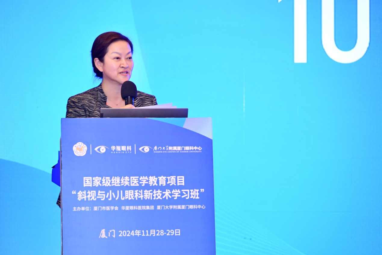 廈門(mén)眼科中心業(yè)務(wù)副院長(cháng)、斜視與小兒眼科學(xué)科帶頭人潘美華教授主持開(kāi)幕式