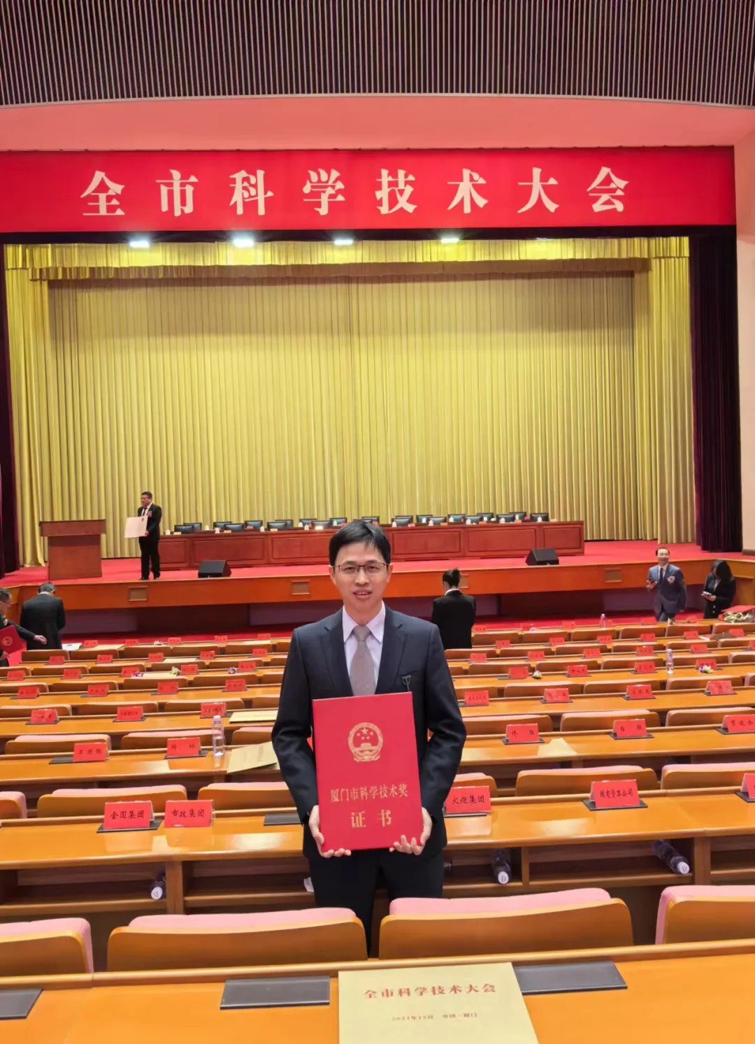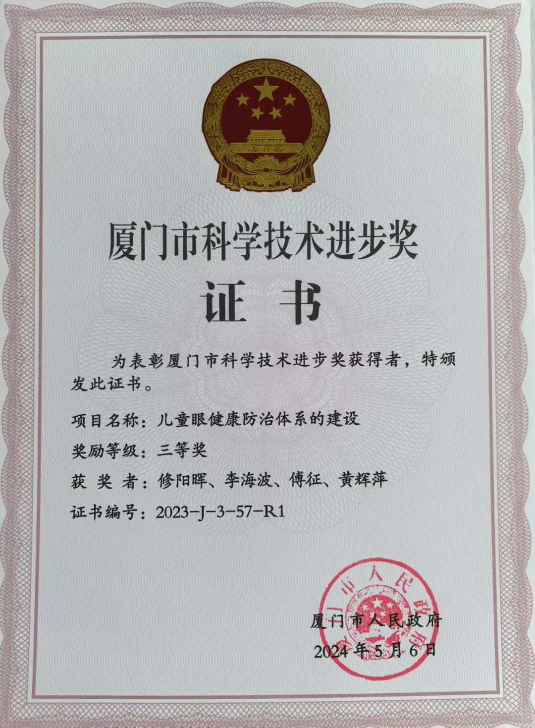 12月16日,廈門(mén)市科學(xué)技術(shù)大會(huì )在廈門(mén)人民會(huì )堂隆重舉行,大會(huì )現場(chǎng)為獲得2023年度廈門(mén)市科學(xué)技術(shù)獎的科研人員代表頒獎。由廈門(mén)眼科中心作為第一完成單位,斜視與小兒眼科修陽(yáng)暉博士、眼外傷及眼底2科李海波博士所在團隊共同完成的“兒童眼健康防治體系的建設”項目喜獲廈門(mén)市科學(xué)技術(shù)進(jìn)步獎三等獎,修陽(yáng)暉博士應邀出席盛典并代表科研團隊領(lǐng)獎。