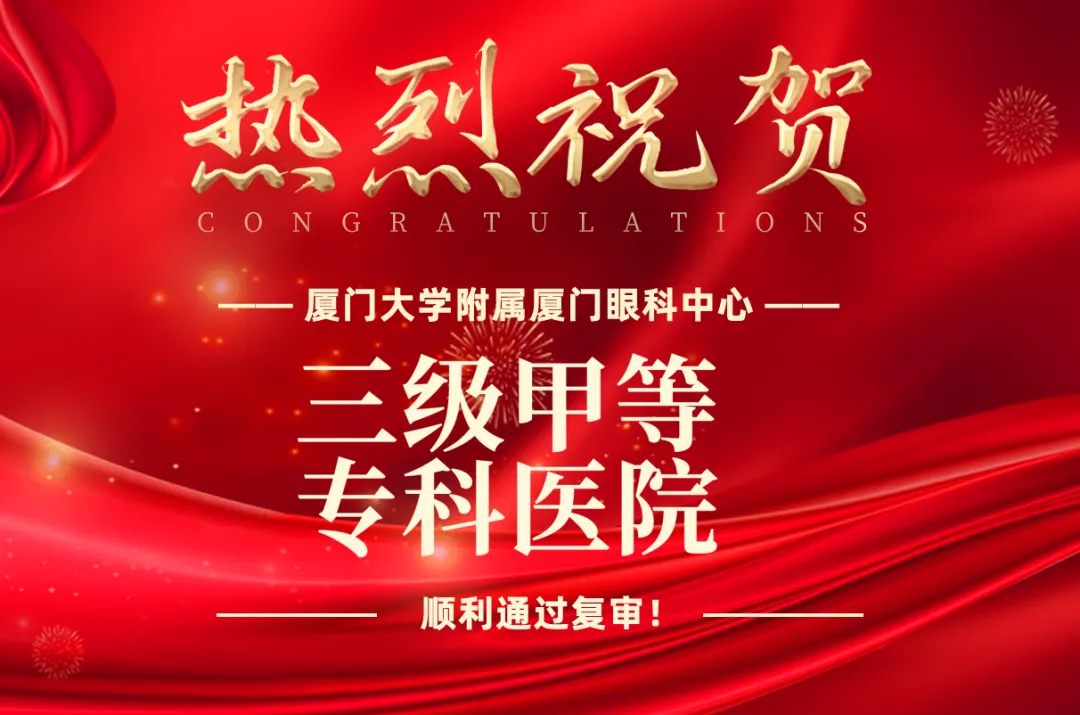 2024年12月31日,福建省衛生健康委員會(huì )正式發(fā)文,經(jīng)資格審查、現場(chǎng)評審、綜合評分、結果公示,確定廈門(mén)大學(xué)附屬廈門(mén)眼科中心(以下簡(jiǎn)稱(chēng)“廈門(mén)眼科中心”)為三級甲等專(zhuān)科醫院。廈門(mén)眼科中心2004年被評為“三甲”醫院后,此次順利通過(guò)“三甲”復審。