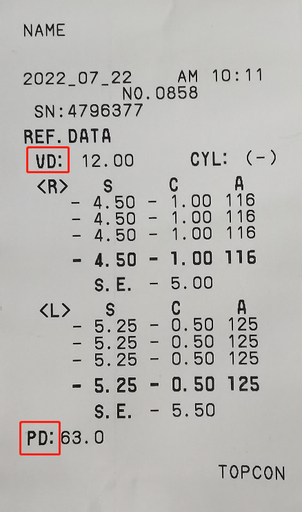 其他數據:VD、PD“VD”是指鏡眼距,在視力檢查中,VD=12.00mm,即我們平常戴眼鏡時(shí)鏡片后頂點(diǎn)到眼球角膜前面的距離。