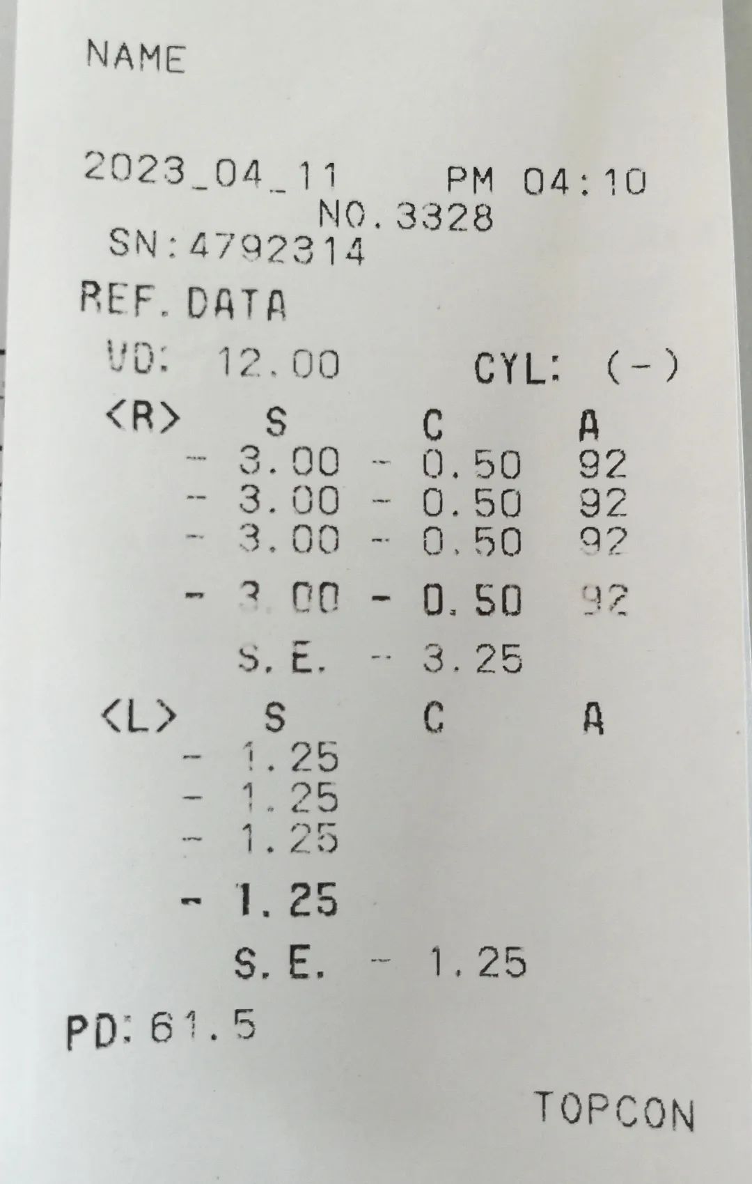 以上面這張圖的右眼數據為例:右眼300度近視,50度散光,散光軸位92,兩眼瞳距61.5mm。